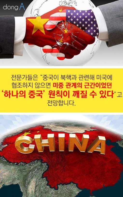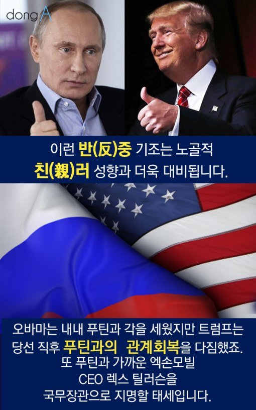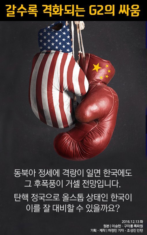 #07. 전문가들은 "중국이 북핵과 관련해 미국에 협조하지 않으면 미중 관계의 근간이었던 '하나의 중국' 원칙이 깨질 수 있다"고 전망합니다. #08. "워싱턴 아웃사이더가 자신의 명성에 걸맞게 중국에 기습 공격을 날렸다. 2일 통화가 중국의 속내를 떠보기 위한 사업가 출신 특유의 일회성 승부수임이 아니었음이 드러났다" 폭스뉴스 #09. 다만 경제적 상호 의존도가 높은 미중 관계의 특성상 중국이 경제 보복에 나서면 미국도 치명상을 입을 수 있습니다. 하나의 중국 포기 카드를 계속 밀어붙일 수 있을지 의문이란 지적이 나오는 이유죠. #10. 이런 반(反)중 기조는 노골적 친(親)러 성향과 더욱 대비됩니다. 오바마는 내내 푸틴과 각을 세웠지만 트럼프는 당선 직후 푸틴과의 관계회복을 다짐했죠. 또 푸틴과 가까운 엑손모빌 CEO 렉스 틸러슨을 국무장관으로 지명할 태세입니다. #11. 갈수록 격화되는 G2의 싸움 동북아 정세에 격랑이 일면 한국에도 그 후폭풍이 거셀 전망입니다. 탄핵 정국으로 올스톱 상태인 한국이 이를 잘 대비할 수 있을까요?