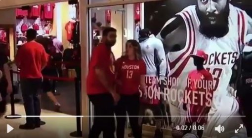 영상을 소개한 영국 데일리스타에 따르면 이 커플은 미국 프로농구 팀 휴스턴 로키츠 홈경기장에서 포착됐다. 한 방송국이 경기장 내 주변 모습을 생중계하다가 두 사람의 모습을 카메라에 담았다는 것.