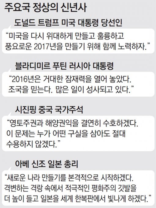 한반도를 둘러싼 강대국의 ‘스트롱 맨’ 지도자들은 신년사를 통해 새해 ‘자국 이익 최우선 주의’를 천명했다. 스트롱 맨들은 ‘위대한 나라’ ‘경제대국’ 등 대중을 자극하는 비전을 제시하며 강력한 리더십을 약속했다.
