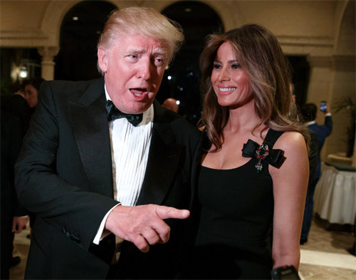 신년 파티 도널드 트럼프 미국 대통령 당선인(왼쪽)이 지난해 12월 31일 부인 멜라니아 여사와 함께 플로리다 주 팜비치 마라라고 리조트에서 열린 신년맞이 파티에 참석해 기자들과 대화하고 있다. 팜비치=AP 뉴시스