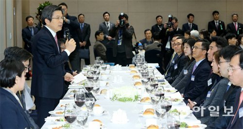 황교안 대통령 권한대행(왼쪽 줄 앞에서 세 번째)이 9일 정부세종청사에서 오찬을 주재하면서 이곳에 근무하는 정부 부처 공무원들을 격려하고 있다. 황 권한대행은 20일 도널드 트럼프 미국 대통령 당선인의 취임식에 맞춰 축하 서한을 보내고, 트럼프 당선인과의 전화 통화를 통해 미국 새 행정부와의 협력을 강화할 방침이다.