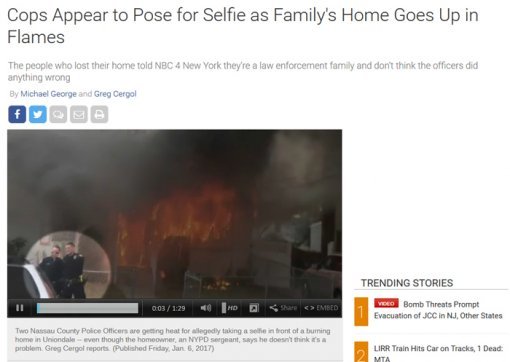 최근 미국 NBC뉴욕 보도에 따르면, 5일(현지시간) 뉴욕 롱아일랜드 유니언데일에서 발생한 화재 현장에서 경찰관 두 명이 ‘셀카’를 찍는 모습이 언론의 카메라에 잡혔다.