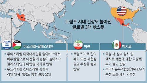 도널드 트럼프 시대의 개막을 앞두고 이란 이스라엘 멕시코가 ‘3대 핫스폿(hot spot·분쟁지역)’으로 떠오르고 있다. 트럼프 미국 대통령 당선인은 버락 오바마 행정부의 정책을 뒤집으며 현상 타파를 꾀할 기세다. 미국과 중국, 유럽연합(EU) 등 강대국 관계가 장기적인 재조정에 들어갈 것으로 보이는 가운데 이 3국 문제는 언제라도 분쟁으로 비화돼 지역과 국제정세를 급격한 불안에 빠뜨릴 수 있다는 우려가 제기된다.