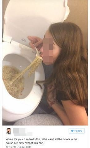 미국의 한 10대 소녀가 변기에 라면을 넣어 먹는 모습을 SNS에 올려 논란이 되고 있다.