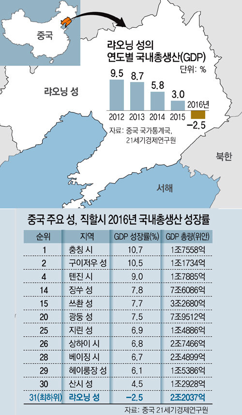최근 중국 성(省)·직할시·자치구 31곳의 2016년 국내총생산(GDP) 순위가 공개되자 북-중 접경 지역인 랴오닝(遼寧) 성 주민들은 큰 충격에 빠졌다. 9일 중국 21세기경제연구원에 따르면 다른 성·직할시·자치구는 4∼10%대의 GDP 성장률을 보인 반면 유독 랴오닝 성만 ―2.5% 성장을 기록했다. 중국의 성과 시 등이 마이너스 성장을 했다는 발표는 역사상 이번이 처음이다.