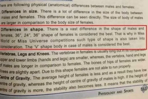 또한 해당 교과서는 여성이 좋은 운동선수가 될 수 없을 거라고 주장한다. 이 교과서는 “여성의 척추는 길지만, 그에 비해 상체와 하체가 짧다. 반면 남성의 척추와 다리는 여성에 비해 길다”며 “여성의 엉덩이뼈는 넓고 무릎이 벌어져 있어서 제대로 달릴 수 없다”고 부연했다.