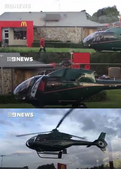 영국 데일리메일은 14일(현지시각) 신원미상의 남성이 호주 시드니에 위치한 패스트푸드점에서 음식을 사서 헬리콥터를 타고 떠나는 모습이 지난 13일 포착됐다고 보도했다.
