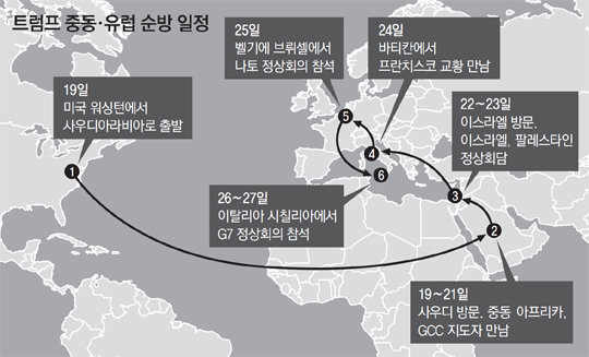 도널드 트럼프 미국 대통령이 19일 9일간의 첫 해외 순방에 나선다. 연방수사국(FBI) 스캔들로 내환(內患)에 빠진 트럼프는 취임 5개월 만에 데뷔하는 국제무대에서 가시적 성과를 거둬 국내 정치 위기를 타개하려 하지만 방문하는 곳마다 어려운 과제들이 놓여 있다.