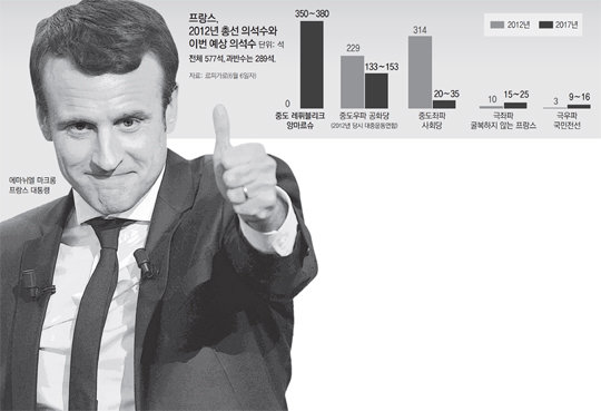 도미니크 레니에 파리정치대 교수는 최근 르피가로지 인터뷰에서 “마크롱의 선거 혁명이 시작됐다”며 이같이 말했다. 11일 총선을 앞두고 에마뉘엘 마크롱 대통령이 이끄는 신생 집권 여당 ‘레퓌블리크 앙마르슈’(전진하는 공화국)가 약진하면서 기성 정당들이 대선에 이어 총선에서도 대패할 조짐이 보이는 상황을 상징적으로 표현한 것이다.