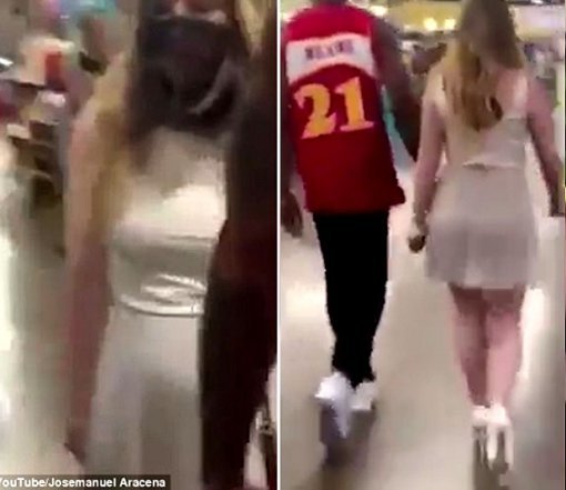 남자는 주변 시선을 의식하지 않고 태연하게 마트 여기저기를 돌아다녔고 여성은 아무런 저항도 없이 남자가 이끄는 대로 따라다녔다. 주변 사람들이 따라가며 웃음을 터트려도 남자는 신경 쓰지 않았다.