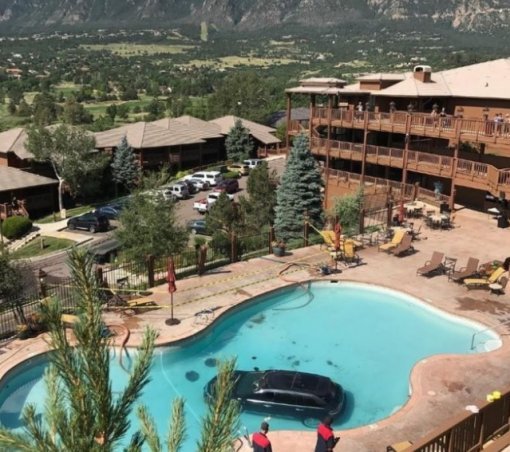 보도에 따르면 사고는 콜로라도 스프링스 샤이엔 마운틴 리조트에서 발생했다. 70대 여성 운전자가 가속 페달을 브레이크로 착각해 밟았고, 차는 다른 차를 들이받은 뒤 시속 97km의 속도로 언덕을 넘어 울타리를 뚫고 수영장으로 돌진했다.