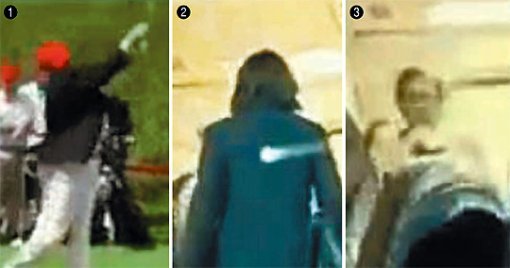 17일 도널드 트럼프 미국 대통령 트위터에 올라온 힐러리 클린턴 전 국무장관 관련 영상. ① 트럼프가 힘차게 티샷을 하고 ② 비행기에 오르는 클린턴이 이 공에 등을 맞는다. ③ 클린턴은 곧바로 앞으로 쓰러진다. 도널드 트럼프 트위터 캡처