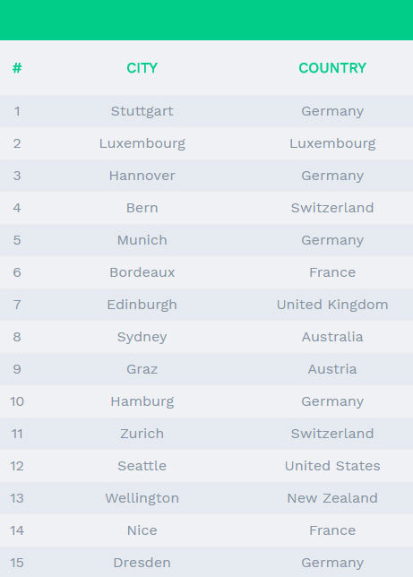 2위는 유럽 룩셈부르크의 수도 룩셈부르크, 4위는 스위스 베른, 6위는 프랑스 보르도, 7위 영국 에든버러, 8위는 호주 시드니였으며, 오스트리아의 그라츠가 함부르크와 함께 공동 9위를 기록했다.