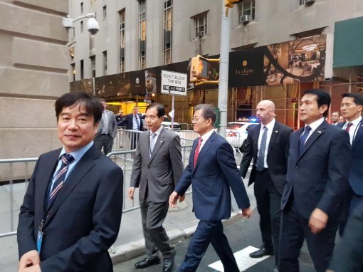 청와대는 19일 공식 페이스북을 통해 “120여개국 정상들이 모인 뉴욕의 교통체증으로 인해 세 블록을 걸어서 이동했다. 수행원들 역시 뉴욕 거리를 정신없이 뛰어다닌 오후였다”며 동영상과 사진을 게재했다.