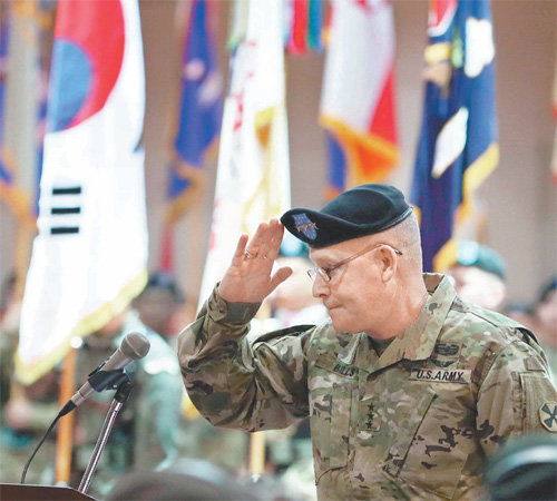 5일 경기 평택시 미군기지에서 열린 미 8군사령관 이·취임식에서 전임 토머스 밴덜 중장에 이어 신임 사령관으로 임명된 마이클 빌스 중장이 취임사를 마친 후 거수경례를 하고 있다.