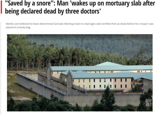 의사 3명으로부터 사망판정을 받은 남자가 사인 파악을 위해 부검을 하려는 순간 코를 골아 목숨을 건진 황당한 일이 스페인에서 벌어졌다.