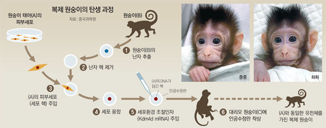 쑨창 중국과학원(CAS) 신경과학연구소 선임연구원 연구팀은 긴꼬리원숭이 태아의 피부세포를 이용해 지난해 말 복제 원숭이 두 마리를 건강하게 탄생시켰다고 국제학술지 ‘셀’ 24일자에 발표했다. 두 원숭이의 이름은 중국을 의미하는 ‘중화(中華·Zhonghua)’를 한 글자씩 딴 ‘중중’과 ‘화화’다.