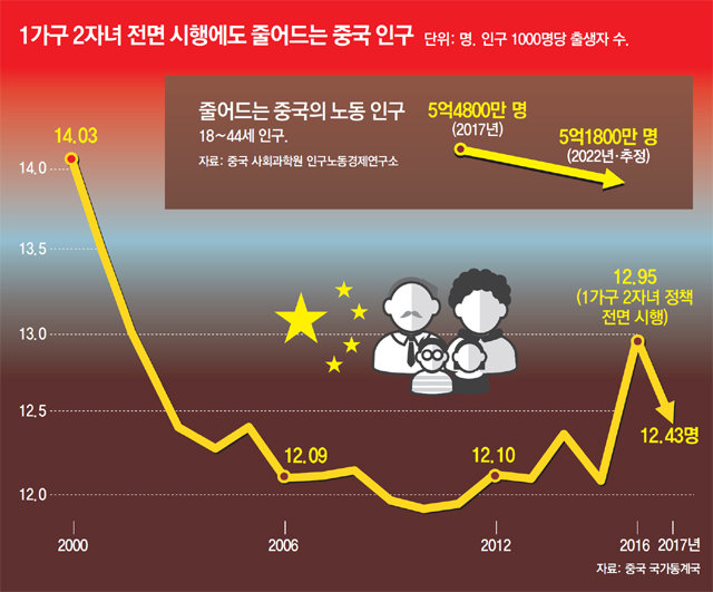 중국에서 저출산 고령화, 노동인구 감소가 경제에 미칠 영향에 대한 위기감이 확산되고 있다. 중국 국가통계국이 이달 지난해 출생자 수와 출생률을 발표하면서 촉발됐다. 지난해 출생자 수는 1723만 명으로 2016년에 비해 63만 명이 줄었다. 1000명당 출생자 수도 12.43명으로 2016년 12.95명보다 크게 감소했다.