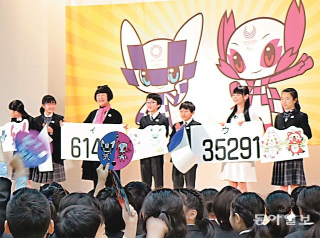 28일 도쿄 시나가와(品川)구의 초등학교 호요노모리(豊葉の森) 학원 강당. 무대 위 세 후보작에 던져진 표수가 공개되자 전교생 560여 명 사이에서 환성이 터졌다. 2년 뒤 열리는 2020년 도쿄 올림픽 공식 마스코트는 일본 초등학생들의 투표로 결정됐다. 지난해 8월 공모에 참여한 2042개의 디자인 중 전문가들이 최종 후보 3개를 압축했고 약 3개월간 전국 20만5755개 학급의 초등학생이 이 중 하나에 표를 던졌다.