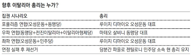 향후 정부 구성의 키 역시 두 당이 쥐고 있다. 오성운동은 디마이오 체제 이후 기존 정당과 연대하지 않는다는 내부 방침을 깨고 연정을 통한 집권 의지를 밝혀 왔다. 오성운동과 동맹당이 반EU와 반난민을 고리로 연정을 구성한다면 유럽 주요 국가 중 최초로 포퓰리즘 세력이 집권하게 된다. 그러나 동맹당 마테오 살비니 대표(45)는 5일 “내가 집권을 상의해야 할 대상은 우파 연합”이라며 우선순위를 명확히 했다. 이는 세력으로 1위를 차지한 우파연합 구성원들 간에 ‘1당이 총리를 차지한다’는 내부 합의를 총선 전에 이뤄 자신이 총리가 될 가능성이 높기 때문이다. 다만 우파 연합만으로는 정부 구성이 어려워 다른 당을 끌어들여야 한다. 이 때문에 동맹당에서는 오성운동과 우파연합의 공동 정권도 구상하는 것으로 전해졌다. 정부 구성 권한 위임권을 갖고 있는 세르조 마타렐라 대통령이 포퓰리즘 정당에 비판적인 것 역시 향후 정부 구성의 또 다른 변수다.