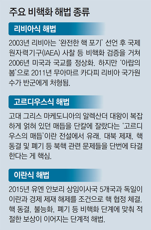 이런 가운데 트럼프의 언급이 나오자 정부는 당혹스러운 표정이다. 트럼프 대통령은 비핵화 단계에 맞춰 적절한 보상을 약속하는 ‘이란식 해법’에 대해 그동안 “최악의 합의”라며 부정적인 입장을 거듭 밝혔다. 당연히 북한에 이를 적용하는 것도 반대한다. 위성락 전 주러시아대사는 “미국과 북한 중국의 틈바구니에서 ‘운전자’ 역할을 해야 할 정부의 역량이 본격적으로 시험대에 올랐다”고 봤다. 정부 고위 관계자는 “대미 공조를 전제로 리비아와 이란식 해법을 섞는 ‘제3의 안’을 만드는 것도 가능할 것”이라고 말했다.