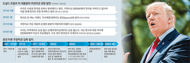 지난해 문 대통령의 첫 방미 당시 트럼프 대통령은 사드(THAAD·고고도미사일방어체계)의 조속한 배치 완료를 요청하며 주한미군 주둔 사실을 강조했다. 그는 당시 참모들과의 회의에서 사드가 배치되지 않으면 주한미군을 철수하라고 언급한 것으로 알려졌다. 또 올해 평창 겨울올림픽 때 한미 자유무역협정(FTA) 협상 과정에서 주한미군 철수 검토를 지시했다가 존 켈리 비서실장과 갈등을 빚었다는 외신 보도가 나오기도 했다.