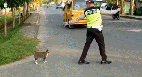 이 모습을 본 경찰은 수신호로 고양이에게 잠깐 대기 할 것을 지시했고 고양이는 그 지시에 따라 움직이지 않고 그대로 길 가에 서 있었다.