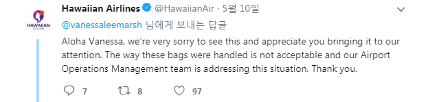 하와이안항공은 “이러한 일이 발생하게 돼 매우 죄송하게 생각한다. 또한 이러한 일이 있었다는 것을 알게 해줘서 감사하다”고 전했다. 이어 “수화물을 이런 식으로 다루는 것은 용납될 수 없으며 우리 항공사는 이 문제에 대해 철저하게 조사할 것”이라고 덧붙였다.