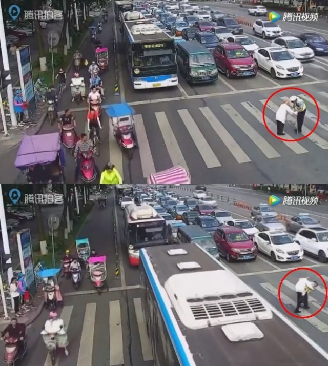 이때 이 구역 담당 교통경찰 친 웨이지에(Qin Weijie)가 노인에게 달려가 노인을 등에 업고 중앙선 부근으로 이동, 노인을 돌보며 다음 보행 신호를 기다렸다.
