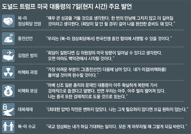도널드 트럼프 미국 대통령이 7일(현지 시간) 북한의 비핵화 완성에 대한 보상으로 국교 정상화를 처음으로 제시했다. ‘원하는 것을 빨리 얻고 싶으면 미국의 요구대로 최대한 빨리 비핵화를 끝내라’는 메시지를 북한에 던진 것으로 해석된다. 트럼프 대통령은 이날 북-미 정상회담과 관련한 여러 문제에 대해 이전보다 훨씬 더 구체적이고 명확한 대답을 내놨다.