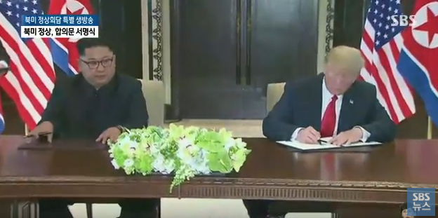 이날 합의문 서명 후 트럼프 대통령은 “한반도 관계는 이제 과거와는 크게 다른 상황 될 것”이며 “그 누가 기대했던 것 이상으로 좋은 만남 좋은 결과”를 이뤘다고 말했다. 아직 구체적인 내용은 밝히지 않았다.
