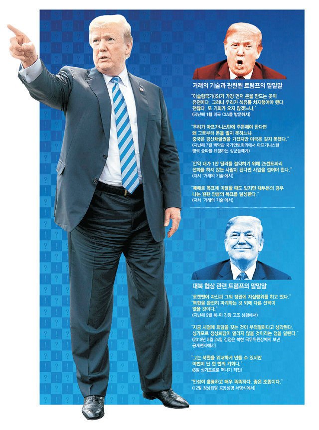 세계 최강국 미국의 최고지도자가 된 후에도 트럼프 대통령은 사업적 마인드를 그대로 드러냈다. 북-미 정상회담 후 한미 연합훈련 중단 문제를 언급하면서도 “(한미 연합 군사훈련에) 많은 예산이 들어가고 있다. 한국도 돈을 내고 있지만 100%는 아니다. 이 문제에 대해서는 다시 한번 얘기해야 된다고 생각한다”고 말했다. 일반 정치인들이 비록 속마음엔 돈이 있다고 하더라도 에둘러 말하거나 다른 비유적 수사로 표현하는 것에 비하면 너무나 적나라한 화법이다.
