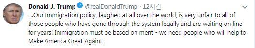 또 다른 트윗에선 “이민 정책은 메리트에 기초해야 한다”며 “우리는 미국을 다시 위대하게 만드는 것을 도울 사람들이 필요하다”고 했다. ‘메리트 시스템’은 이민 신청자의 학력이나 경력 등 미국에 대한 기여도를 측정해 영주권을 발급하는 제도다.