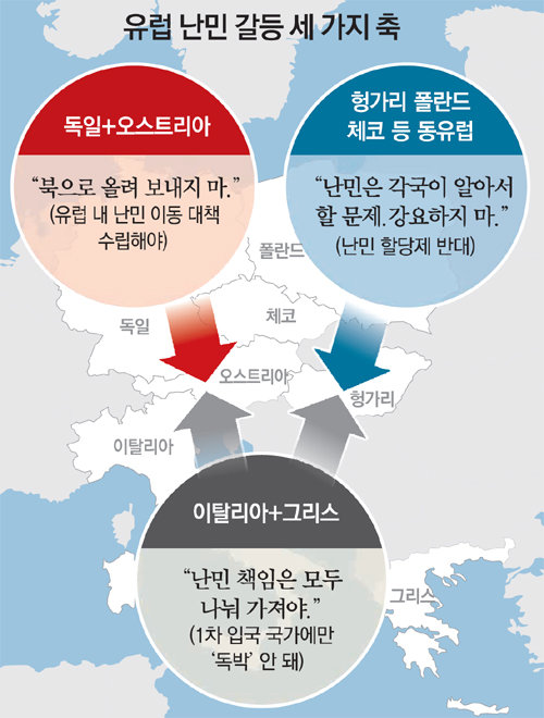 현재 EU 회원국들은 난민 문제와 관련해 크게 3개 진영으로 갈라져 대립하고 있다. EU의 최대 부국 독일은 난민들의 ‘2차 이동’을 막는 방안을 추진 중이다. 난민들이 이탈리아와 그리스를 통해 유럽 땅을 밟아도 최종 목적지는 독일인 경우가 많기 때문이다. 이웃나라 오스트리아도 이에 동조한다. 1990년 더블린조약은 난민이 처음 입국한 EU 국가에서만 망명 자격 심사를 받아야 하고 다른 국가로 이동해 난민 신청을 하면 처음 입국한 국가로 이송하게끔 규정하고 있다. 하지만 실제 이송되는 경우가 지금까지 거의 없었다.