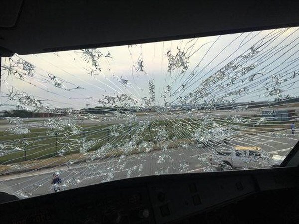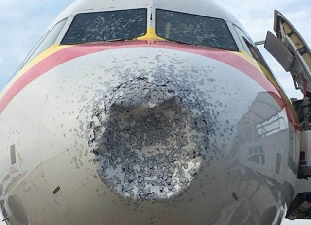 승객 150여 명을 태운 여객기가 비행 중 우박을 만나 조종석 앞 유리창이 깨지고 기체 앞부분이 찌그러지는 아찔한 일이 중국에서 일어났다.