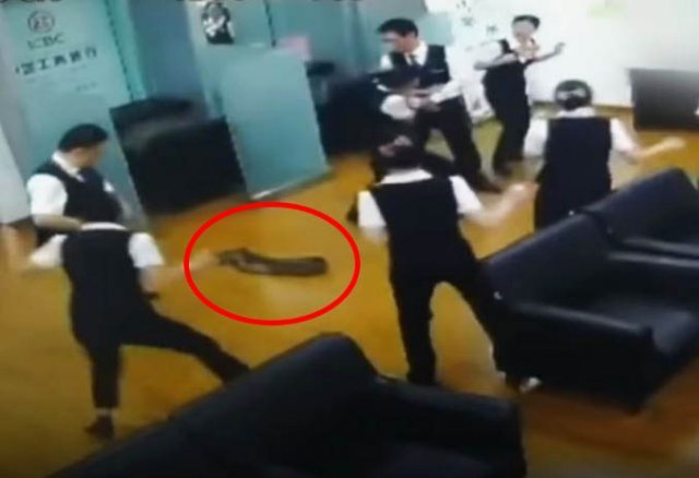 중국의 한 은행 천장에서 거대한 비단뱀이 떨어져 직원들이 혼비백산 달아나는 일이 일어났다.