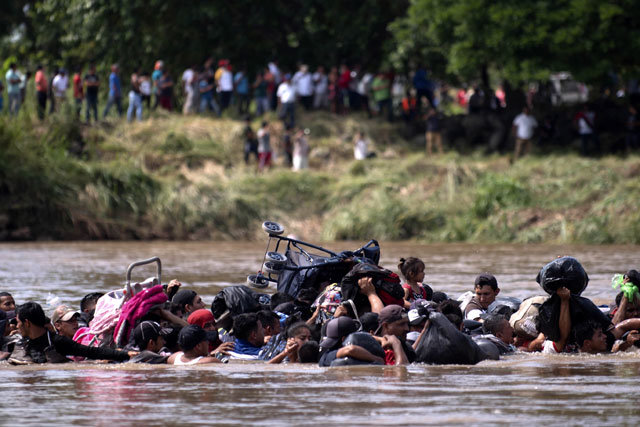 “美로 가자” 강 건너는 이민 행렬 중미 이민자 행렬 ‘캐러밴’ 구성원 일부가 29일 과테말라와 멕시코