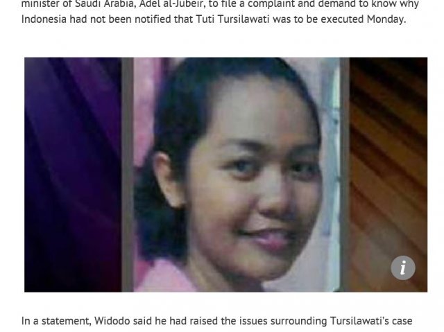 31일(현지시간) 워싱턴포스트 보도에 따르면, 투티 투르실라와티라는 이름의 이 여성은 지난 29일 사우디에서 처형됐다.