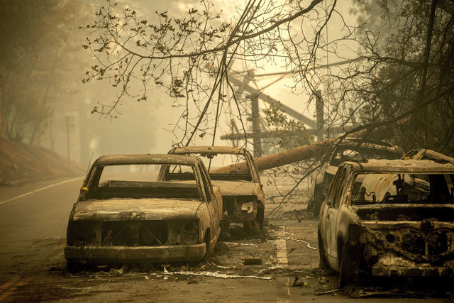 불에 탄 차량과 쓰러진 가로수…. 산불이 휩쓸고 간 미국 캘리포니아 북부 파라다이스 마을은 폐허가 됐다. 8일 캘리포니아주 북부와 남부에서 동시다발적으로 발생한 대형 산불로 인명 및 재산 피해가 속출하고 있다. 10일 오후 현재 캘리포니아 화재로 인한 사망자는 25명이며 실종자도 110명에 이른다.