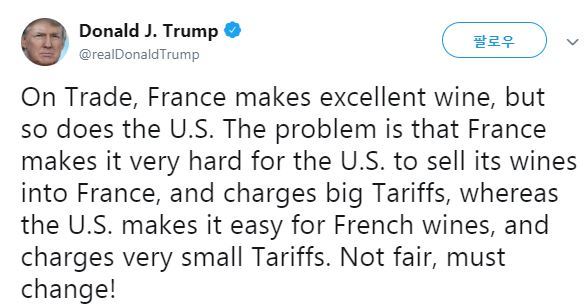 트럼프 대통령은 “프랑스는 훌륭한 와인을 만들지만 미국 역시 마찬가지다”며 “프랑스는 미국산 와인에 높은 관세를 매기지만 미국은 프랑스산 와인에 아주 작은 관세만 붙일 뿐이다”고 말했다. 이어 “이는 불공평하다. 반드시 바뀌어야 한다!”고 강조했다. 프랑스에서 열린 제1차 세계대전 종전 100주년 기념식에 참석했을 당시 불편해진 심기를 여과 없이 드러낸 것이란 해석이 나온다. 당시 기념식에서 마크롱 대통령을 비롯한 주요국 정상들은 트럼프 대통령을 겨냥해 민족주의와 포퓰리즘을 경계해야 한다고 경고했다.
