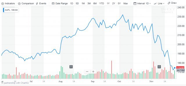 ◇ 애플 주가 전고점 대비 20% 급락 : 최근 애플은 고전을 면치 못하고 있다. 애플의 주가는 연일 급락하고 있다. 이는 1회계분기(10월~12월) 매출 전망이 시장 예상에 미치지 못했기 때문이다. 게다가 애플의 일부 납품업체들이 실적 경고를 내놓아 아이폰 수요둔화 우려를 부채질했다.