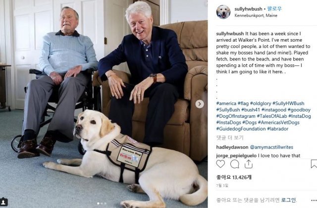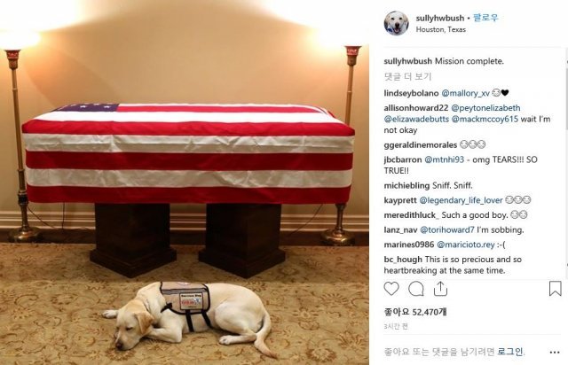 부시 전 대통령 대변인인 짐 맥그레이스는 2일(현지시간) 설리가 주인의 시신이 있는 관 앞에 엎드려있는 모습의 사진을 트위터에 올렸다. 사진 옆에는 ‘임무 끝’이란 글도 올렸다. 주인을 돕는 설리의 임무는 끝났지만, 설리는 아직도 그 곁을 떠나지 않고 있다는 것이다.