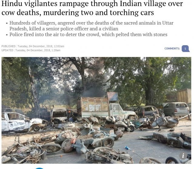 소를 성스러운 존재로 숭배하는 인도에서 힌두교도들이 소로 의심되는 동물 사체를 발견하고는 격분해 차량 여러 대를 불태우고 2명을 살해했다.
