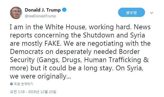 도널드 트럼프 미국 대통령이 연방정부 셧다운 직후 트위터에 올린 글. 그는 “셧다운과 미군의 시리아 철군에 대해 우려하는 언론