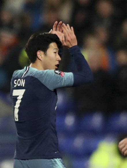 토트넘 손흥민(왼쪽)이 4일(현지시간) 영국 버킨헤드 프렌턴파크에서 열린 트랜미어 로버스(4부리그)와의 2018-19시즌 FA컵 64강전에서 1골 2도움의 활약을 펼치고 조지 마시와 교체되고 있다.