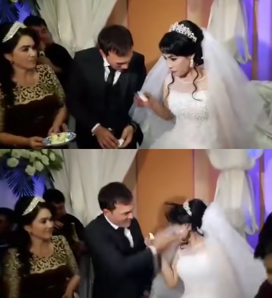 이후 신부가 신랑에게 케이크를 먹여줄 차례가 왔다. 신부는 신랑에게 케이크를 먹여주는 척하면서 뺏는다. 신부는 장난을 치며 결혼식의 엄숙한 분위기를 풀어볼 심산이었다.
