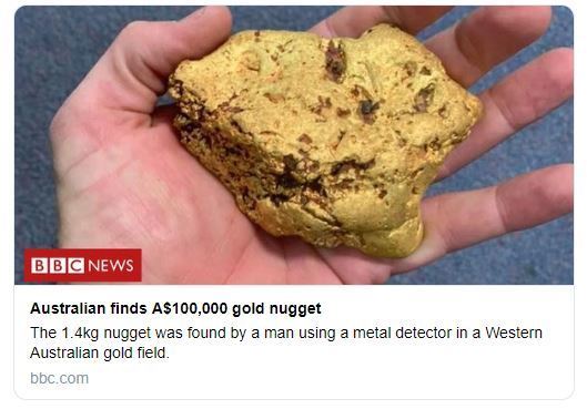 호주에서 한 남성이 금속 탐지기를 활용해 1.4㎏의 금 덩어리를 발견했다고 20일(현지시간) BBC가 보도했다.