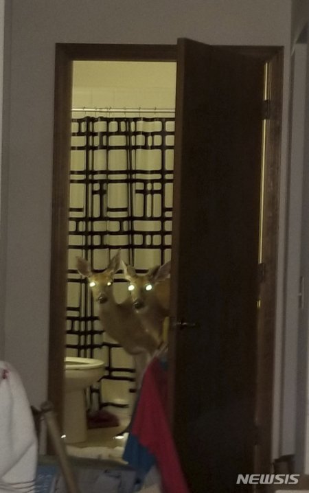 지난 4일(현지시간) 미 인디애나주 디케이터 경찰이 공개한 사진에 사슴 2마리가 한 아파트 욕실에서 문 밖을 응시하고 있다.