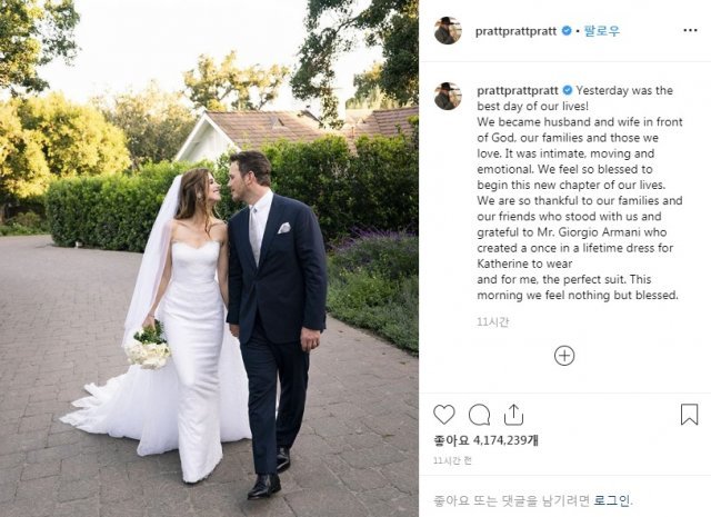 지난해 여름부터 교제를 시작한 프랫-캐서린 커플은 1월 약혼을 공개했다. 4월 ‘어벤져스:엔드게임’ 시사회 때 처음 공식석상에 커플로 등장했다.