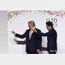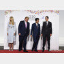 트럼프 대통령과 아베 총리가 28일 개별 정상 촬영식 중 떨어져 있던 이방카와 쿠슈너에게 같이 사진 찍자고 손짓으로 부르고 있다.